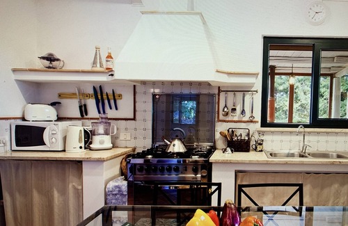The main house has an open plan living room with kitchen, two double bedrooms and two bathrooms. The nearby summer house, with wifi connection, has a bedroom with private bathroom. The living room / kitchen leads directly to the covered terrace with a hanging bed, a barbeque, a large dining table and gas heaters for spring and autumn.