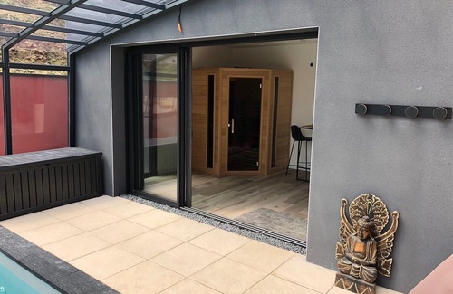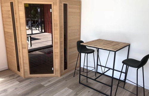 This space opens onto a heated swimming pool of 6m50x3m50 under shelter (essential in Brittany). Possibility of opening it according to the time or on the contrary to be able to benefit without leaving it, and with ambient temperature. A second terrace makes it possible to benefit from this space with living room in resin braided for 10 people.