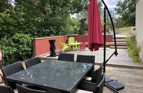 Ground floor: living room, kitchen, living room and toilet. The living room opens onto a large wooden terrace with a dining set for 8 people, a barbecue, a brazier and a fountain