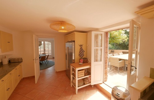 On the ground floor there is a bedroom with en-suite bathroom (not toilet), laundry room (2 washing machines and 2 dryers), dining area with round table (can be extended to an oval table) and kitchen with direct access to outdoor mosaic dining table by barbecue area in the garden. The kitchen is equipped with American fridge / freezer with ice cubes and filtered cold water, dishwasher, oven, microwave, gas hob, kettle and Nespresso coffee machine.