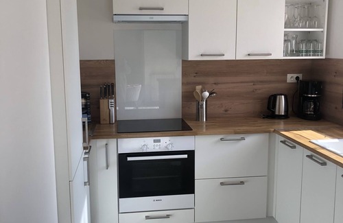 Equipped kitchen: oven, induction hob, microwave, dishwasher, coffee maker, teapot, toaster