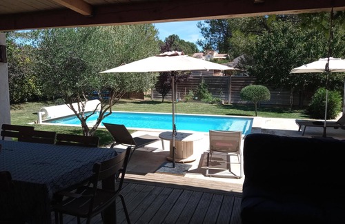 Outside, you can enjoy the 8 mx 4 m swimming pool for private use, secured by an automatic above-ground shutter, with a submerged beach for chatting, sunbathing or reading in the water, its sunbathings, deckchairs and parasols , all on a peaceful 500m2 plot, with a Pool House for a drink or a shower to cool off.