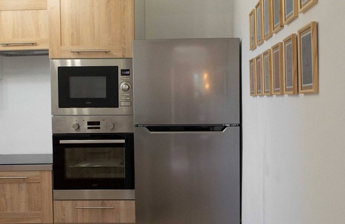 a fully equipped kitchen with stove, oven, fridge, freezer, dishwasher, coffee maker…