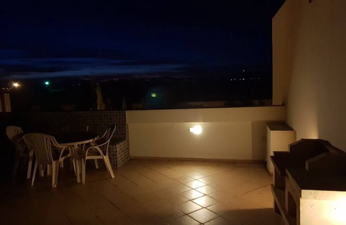 The bedroom of the apartment has a terrace with a table and two chairs, while a long and panoramic terrace runs alongside the other two rooms and contains rattan tables and chairs.