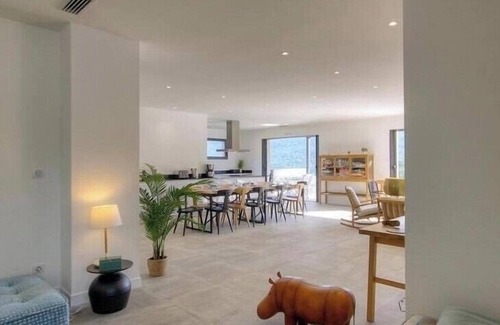 On the heights of Porticcio, in a quiet area, facing the maquis and the mountains, magnificent villa (new, construction 2019). Beach, shops and entertainment 2.5km. Many walks and hikes nearby. Ideal for 1, 2 or 3 families.
