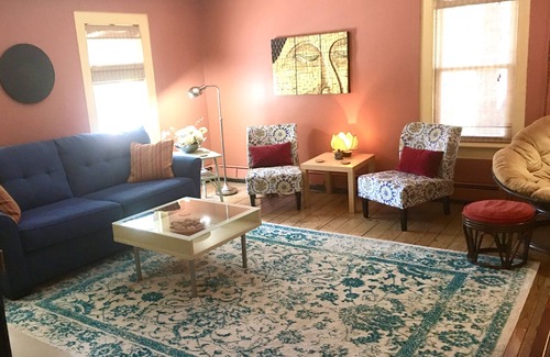 Treat yourself to a luxurious and inspiring getaway "Above the Books", just up the stairs from Woodstock’s legendary MIRABAI BOOKSTORE. Above the Books is a beautiful, spacious and sumptuously appointed 2-bedroom apartment. Located a block from the Village Green and NYC bus stop, and steps from Woodstock's superb dining, shopping, art, and attractions, there's absolutely no need for a car (but plenty of off street parking space if you bring one).