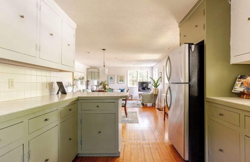 This delightful cottage boasts charming details and original hardwood flooring. An open dining room and living room are perfect for sharing a meal or playing a board game. A spacious kitchen is stocked with all the essentials for cooking a delicious breakfast before heading out for shopping downtown, a hike at Bass Lake or a ride on Tweetsie the train.