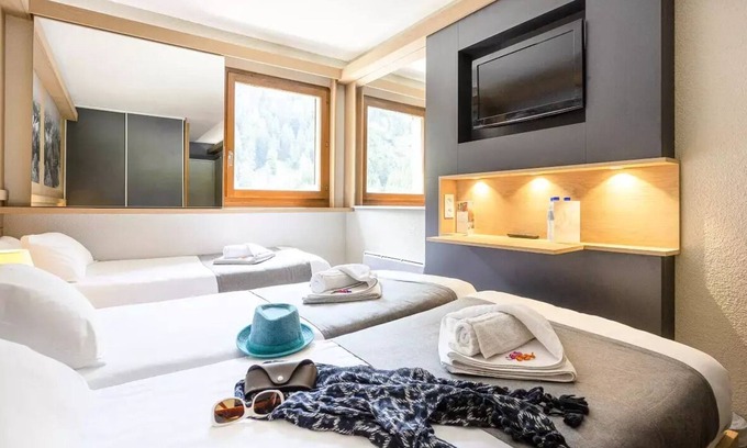 Squ@t Teens from 11 years old accessible with their Anim'MMV Distance tracks : 150 m Baby kit : Free - Baby kit loan (- 2 years old): Cot, baby chair, changing mattress, pot and bath deckchair - upon reservation and subject to availability Bedding : Included Towels : provided (changed 2x/week) Beds made on arrival : daily Shuttle bus : yes - with surcharge - on-site rates and regulations Outdoor parking : supplement - 280 m from Village Club Near airport : Turin Airport #TRN (87.9 km), Geneva International Airport Cointrin #GVA (121.0 km) Restaurant : all inclusive formula Tourist tax : to be paid on site at current rate Television : Included Green key Bedding Household included Number of bedrooms : 1 Number of pieces : 1 Number of toilets : 1 Number of bathroom : 1 Hair dryer Surface (m²) : 14 Television Wireless Number of single beds : 3