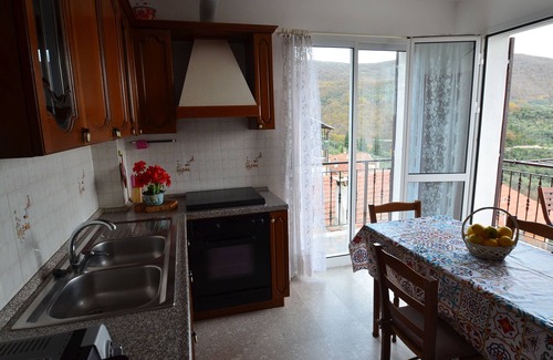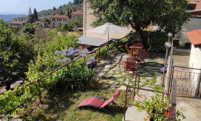 Casa Fanin is on the first floor in the house next to the village shop. Two bedrooms (one with a double bed 1600x200 and one with two single beds 90x200) and a modern shower room with an additional bathtub offer comfortable space for 4 people. The kitchen is large and well equipped. Drink your first coffee in the morning on the balcony with a sea view. There is also plenty of space in the living room with satellite TV and a seating area. The apartment is completely renovated and has a wonderful panoramic view over the valley and the olive groves to the sea. On clear days you can see the full moon glittering on the Mediterranean. In front of the house is your private garden. Enjoy the natural shade under the sprawling arms of the old pear tree or relax while sunbathing in a deck chair with a sea view. Four-legged guests are warmly welcome.
