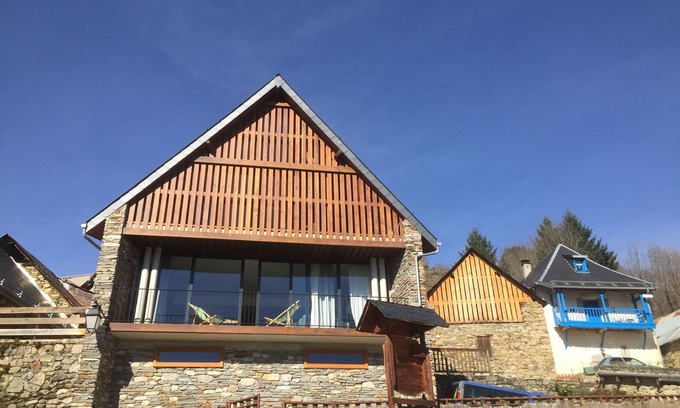 Architect's house in stone and wood, with panoramic views of the Pyrenees and southern exposure. Located in the heart of Cathervielle, one of the most beautiful villages in the Larboust valley, between Luchon and Peyragudes.