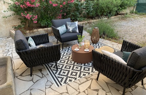 The approximately 150 year old village house is located in a lively, authentic and non-tourist village in the middle of the Languedoc wine fields around Narbonne near the Canal du Midi and about a 45-minute drive from the Mediterranean. The boulangerie for the fresh baguette or the patisserie is a 2-minute walk away. For the daily meals, the terrace in the courtyard-like garden offers peace and privacy. On 183 square meters of living space and 150 square meters of garden there is plenty of space for family and friends. 3 bedrooms, 2 bathrooms, a large living room with fireplace, reading lounge with additional sofa bed, kitchen and dining room were completely renovated in 2013 and tastefully refurbished.