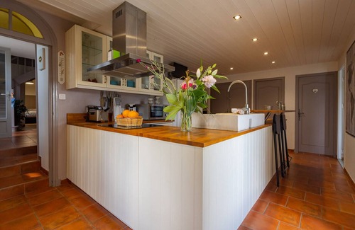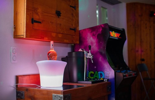 On the other side of the house, the kitchen with bar is 20m2. It is over-equipped (see below) and offers direct access to the small outdoor terrace and the "disco" games room. A themed room, clearly designed for a good time with friends or family, with a real pinball machine, table football and an arcade machine with over 1,200 video games (including Pacman and Donkey Kong). Not to mention the 120-inch smart TV, the lounge area with sofas, the bar area, the bluetooth hi-fi system, the 5-litre keg machine and the disco ball that goes with it!