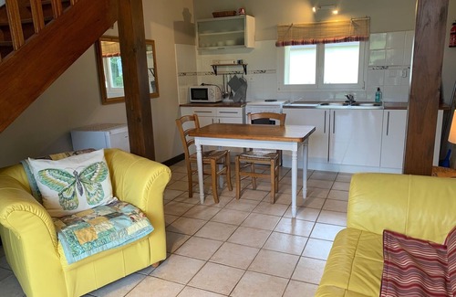 Your vacation rental includes a fitted kitchen, living room / lounge with bay window opening onto the terrace, shower room and WC as well as a mezzanine bedroom upstairs. You will enjoy a private space outside on the large shared terrace and a large family garden with views of the surrounding countryside. Ample parking on site.