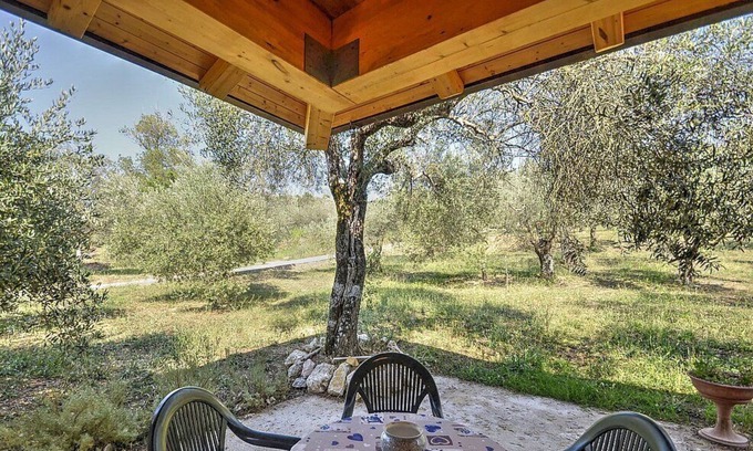 The garden is 30000 square meters (323000 square feet) large. It is partly shaded by characteristic olive trees and by fruit trees. It is equipped with tables and chairs. Here you will also find a brickwork barbecue and a wood-fired pizza oven. From the garden you will enjoy a broad view of the greenery. In the garden you will also find an area where vegetables are grown and you will be able to pick up available vegetables according to the season. You will share the garden with the other guests staying at the complex.