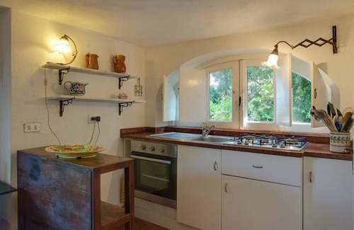 The name of the house refers to its architectural style, in particular the covered arched porch on the facade. The house is structured on two separate levels: on the upper floor there is the bedroom, which can accommodate a double bed or three single beds, and the bathroom; on the lower floor there is the kitchen with dining area and a second bathroom. The two levels are connected by an external lateral staircase. From here, the sea view is exceptional.