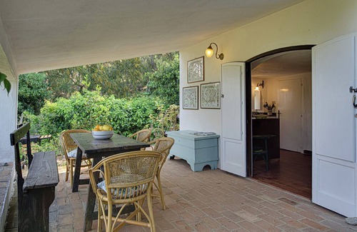 Additionally, the dining room downstairs is equipped with a sofa, which can also be used as an extra bed. The covered porch at the front is ideal for al fresco dining and relaxing. From here, you can admire wonderful sunsets, and you are only a few meters from the organic garden cared for by the property where you can pick seasonal products.