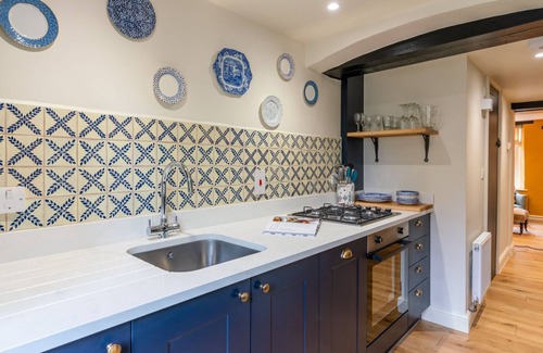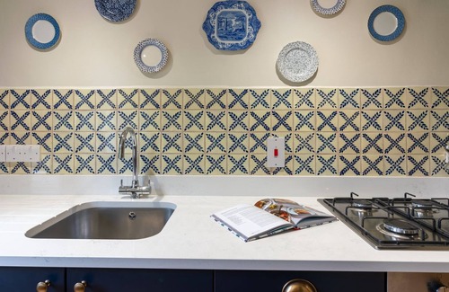 Under the stairs is a useful storage cupboard where you'll find pots and pans and space to store supplies you may bring with you. This is also where the kettle and toaster live. Continue into the stylish kitchen with dark blue cupboards offering a lovely contrast to the pale wooden floor and white surfaces and pretty blue and white plates hanging above the decorative tiling. With a full oven, gas hob, fridge with a freezer box, washer-dryer and even a slimline dishwasher, there is everything practical needed for a self-catering stay. You'll find glassware on a wooden shelf (please do not put anything else on this shelf). A breakfast bar runs along one wall with two high-backed stools. Perch here for your morning coffee and easy meals or relax with the papers as the day begins.