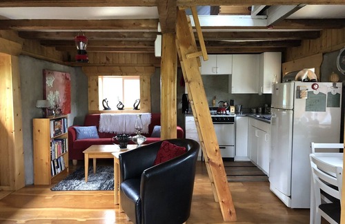 Welcome to Vines and Puppies Hideaway. Located 8km from world famous Jade City BC, Canada. Rustic escape on the edge of wilderness. A quaint cabin with 360 degree mountain views overlooking the pristine waters of Vines Lake. Offering an off grid experience. Gravity feed water system with hot outdoor shower and a outhouse. Cabin is heated with a cozy wood stove and light is using antique lamps. The loft offers a queen bed and balcony. Downstairs you will find a full service service kitchen and fold out couch for extra guests. Dinner and continental breakfast included. Pet friendly. Please note there is no electricity, cell coverage or internet. We promise this will enhance your experience!
