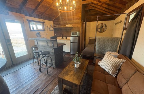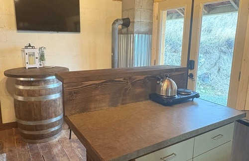 Inside, you'll find 250 sq ft of thoughtfully designed interior spaces that make every square foot count—a comfy queen bed draped in soft linens, a futon couch that folds out for additional sleep options, a stylish converted wine barrel dining table which sits near an island kitchen sitting and eating area, and an old farm-style kitchenette equipped for preparing simple meals. The bathroom spotlights a working toilet, stand up shower, and small vanity for all your bathroom needs.