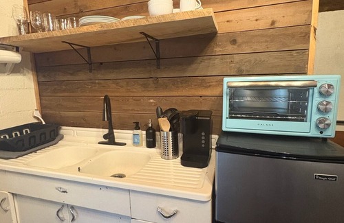 With the queen bed sleeping 2 and the futon sleeping 1, the bunkhouse sleeps up to 3 guests and is perfect for couples, solo adventurers, or anyone yearning for a peaceful getaway. Outside, enjoy a fire pit (seasonal), picnic table, and a stunning view. Additional amenities: Keyless entry, Smart TV, and of course, a Keurig.
