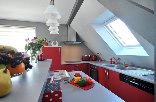 • A large living room with a fully equipped kitchen (dishwasher, oven, microwave, dolce gusto, Alsatian service, steam cooker...)