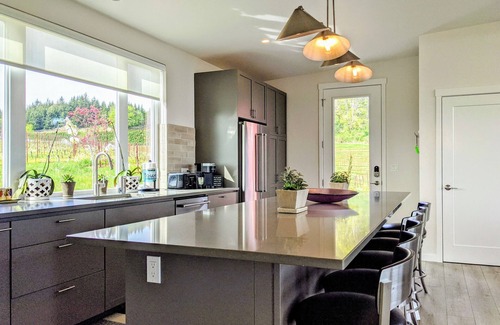 The home welcomes up to four guests comfortably with two spacious master's with en-suite bathrooms. Each room features a king-sized bed, hotel-quality linens, large closets, and private doors to the spacious deck. Start each morning with a stunning view of the vineyard before you even get out of bed. The deluxe en-suite bathrooms are beautifully designed with tiled showers and ample counter space. We also provide hairdryers, shampoo, conditioner, and locally crafted soap bars in each bathroom. In addition, we happily offer luxurious towels and many other bathroom essentials for each guest.