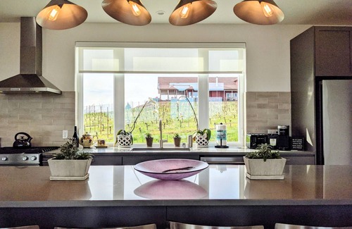 The open kitchen boasts beautiful quartz countertops, brand-new appliances, and everything needed to prepare a family meal or vineyard brunch. Snack and sip at the bar top, or dine together at the dining room table with sweeping views. The spacious living room features a cozy couch, oversized armchairs, and a large flat-screen TV with Streaming Services included—perfect for an intimate movie night with loved ones!