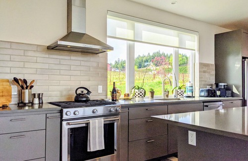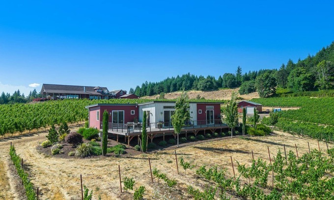 Perfect for a small family or two couples, this sleek vineyard hideaway puts guests at the heart of Oregon Wine Country with endless opportunities to explore. Sip your way through the neighborhood at Zenith Vineyard, Bjornson Vineyard, and Bethel Heights Vineyards just up the road. Bryn Mawr is located only 8 miles outside of the quaint town of Amity or 12 outside the state capitol of Salem, complete with a charming historic downtown and vibrant Saturday farmer’s market that runs from spring through early fall.
