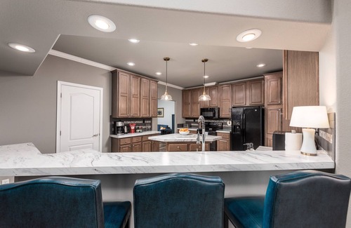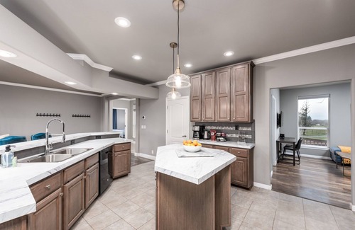 Open the door to Vineyard Vista and you'll be greeted by an open Great Room concept with living room, dining room, and large kitchen. The living room and dining room both offer ample seating and the kitchen is equipped with plenty of dishes, cookware, bakeware, and more so you can easily prepare & enjoy meals while staying at Vineyard Vista! The living room features comfortable seating plus an electric fireplace for extra-cozy vibes and a 55" inch TV for movie nights. Netflix is provided, or you can login to your own streaming services to stay up-to-date on your favorites.