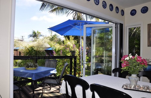 The remodeled galley kitchen is a chef's dream with granite counters, stainless appliances, six burner gas stove and complete drawer of spices for gourmets. The dining area seats 8 comfortably and a trifold door opens onto the deck overlooking a large tropical yard which is incorporated into the living area. There is a BBQ and outdoor shower on the side patio, and off street parking is on the rear of property The property is shared with the constant gardener and hubby who live in the cottage at the back of the large yard, they are the owners and very friendly and helpful if needed.