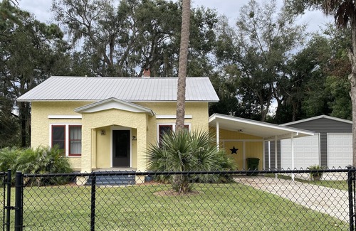 Welcome to our charming 1920s bungalow, located just under 2 miles from the Palatka City Dock and Boat Ramp on the beautiful St. John's River. With original wood flooring, this quaint home offers 3 comfortable bedrooms and two baths, providing a perfect place to relax while you are enjoying your stay in the beautiful North Central Florida area with a multitude of outdoor activities around. Cook up delicious delicious meals in the large, updated fully stocked kitchen with spacious dining room or grab some seafood at Velchoff's Corner or over the bridge at Musslewhites or Corky Bell's; or unwind in the cozy front living room with some streaming channels on the smart TV. The laundry room comes equipped with a washer and dryer, making your stay that much more convenient. Our fully fenced lot is perfect for gilling or outdoor activities. You will be thrilled that some of the best bass fishing spots in the world and some excellent golfing are right outside our doorstep! Not only that, we are a drive away from some of the best Atlantic Ocean beaches, a drive from the oldest Florida city at St. Augustine, are centrally located for some of the smoothest motorcycles rides and Daytona Bike Week, close to the Gatornational drag races, are accessible to some of the most memorable fishing tournaments and festivals like Blue Crab, Bluegrass and Craft Beer. Not to mention the incredible bird watching, biking and hiking trails, and sunrises. Our property offers enough space for trailer, bike and boat parking. Come and enjoy the charm and comfort of our bungalow and make your stay in Palatka a memorable one!