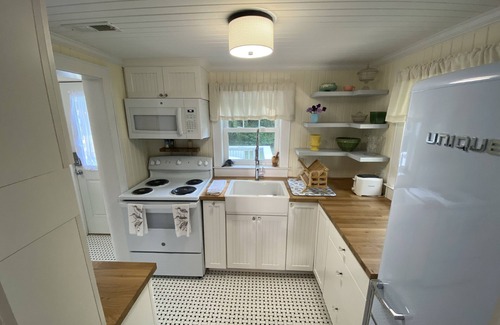 Upon entering Aunt Vid's cottage, you will be transported to an earlier era of tranquility on Roanoke Island. The family restored the original pine floors throughout the cottage. They renovated the kitchen while maintaining its vintage feel with basket-weave tile, a retro fridge, and butcher block counter-tops. The little cottage has a large front porch for enjoying the island breeze. After a day at the beach or fishing on the sea, the outside shower is a private, roomy spot in which to wash away the sand.