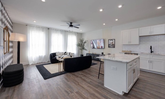 The main living area occupies the entire second floor and is an open-concept space that seamlessly combines style and comfort. Sunlight floods the room through large windows, illuminating the designer furnishings and creating an inviting atmosphere. The living room, with its plush seating and Smart TV, serves as the perfect retreat after a day of exploring Nashville. Just steps away, the impeccably designed kitchen awaits—an entertainer’s dream with top-of-the-line stainless steel appliances, expansive all-white cabinetry, and sleek countertops. The large island, complete with bar seating, is perfect for everything from gourmet dinners to casual breakfasts or a freshly brewed cup of coffee. Every detail has been thoughtfully curated to create a space that is as elegant as it is welcoming, making it the true heart of your stay.