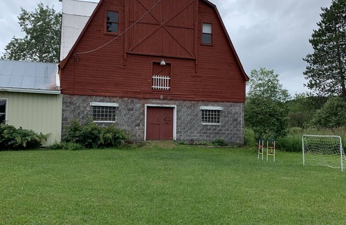 Our vintage farmhouse sits on 40 acres with the Pike River winding through it and a large pond nearby.The house has 2 floors with all 3 bedrooms upstairs in a pass-through layout. Large country kitchen is well suited to family meals, living room, bathroom, and a 3 season porch with many windows on the ground floor.