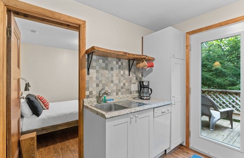 The Vintage Chalet offers a charming, rustic feel with modern updates, including a spiral staircase leading to an open loft bedroom and an additional bedroom on the main floor. (Please note: the spiral staircase makes it unsuitable for children 8 and under.)