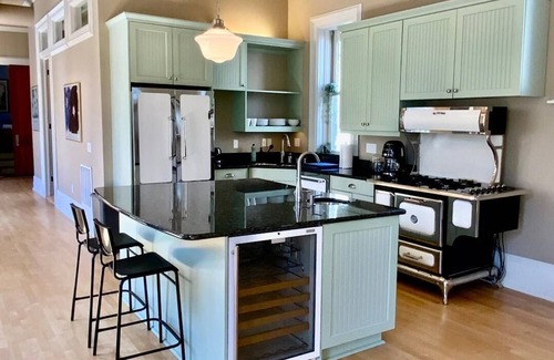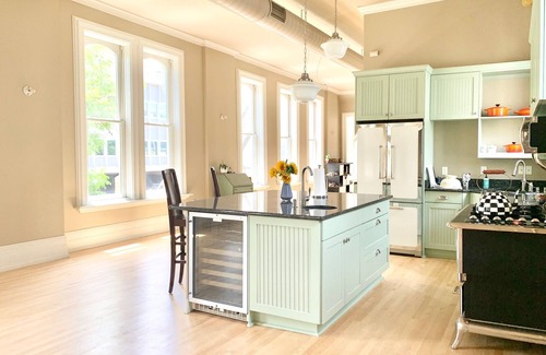 Situated in a Cream City brick building built in 1877, this spacious 2000 sq. ft. second floor walk-up has high tin ceilings, maple floors, a private bedroom with a queen bed, along with two queen size sleeper sofas in the living area. Highlights include a gourmet kitchen featuring granite countertops, a modern vintage fridge and range, a wine fridge and modern vintage Smeg appliances. The bathroom has two sinks and a huge marble steam shower. There is also a desk for working or getting ready for a night on the town.