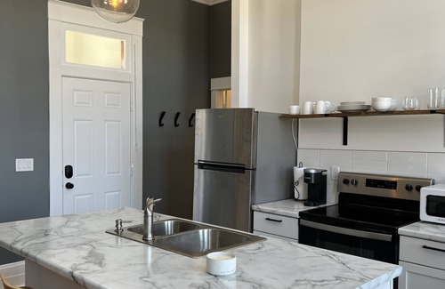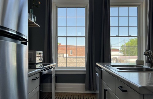 Better than any local hotel experience, come enjoy this beautifully renovated apartment with 12 foot ceilings and large arched windows. Steps to historic downtown Vinton, experience the City of Lights and take in the views of the Benton County Courthouse.