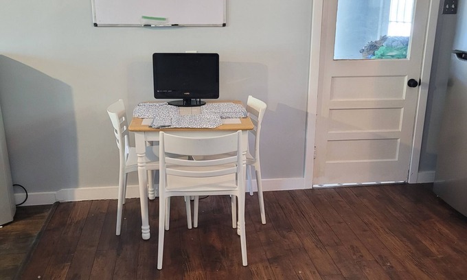 As you step inside, you'll be greeted by the warmth of original hardwood floors and an inviting living space adorned with retro-inspired decor. The cozy living room is perfect for unwinding after a day of exploration, with large windows that fill the room with natural light.