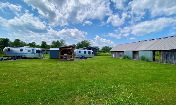 Vintage Villa at Hector Meadows is perfect for groups looking to explore the Finger Lakes region from a convenient yet serene base. Stay put on our 15 acres with meadow trail and swimming pond, or venture out for the region's excellent wineries, hiking, boating, and food! Three separate yet clustered units provide common hangout space as well as privacy to retreat to your own unit: MeadowHouse (sleeps 2 with covered outdoor kitchen) + Firefly Airstream (sleeps 2) + Cricket Airstream (sleeps 2).