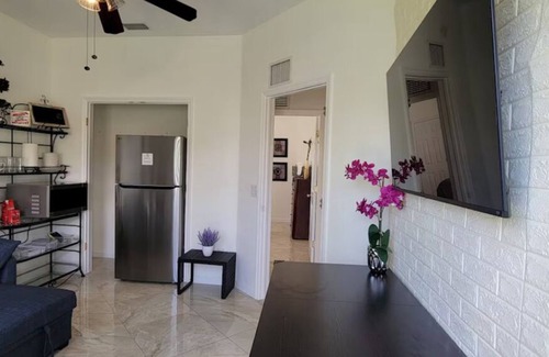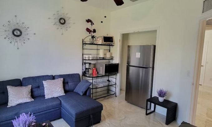 Welcome to Violet and Sunshine Suite: Your Private, Peaceful Getaway in Lehigh Acres. It features a luxuriously decorated 1 bedroom, living, and dining area. There's no kitchen but there's a nice baker's rack stocked with basic essentials, a full-size refrigerator, microwave, and a Ninja coffee maker. While it's attached to the main house, everything is fully private, from parking to sidewalk to the private entrance and backyard. I can't wait to share it with you. Book your stay today!