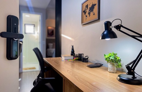 Apartment with a double bed, wardrobe with hanger, split air conditioning, and a balcony. Comfortable environment with a 40" Smart TV, 250Mbps Wi-Fi, and a comfortable sofa; Kitchen with duplex refrigerator, stove, microwave, coffee maker, blender, sandwich maker, dishes, pots, and water purifier; Bathroom with hot water and soft bath towels.