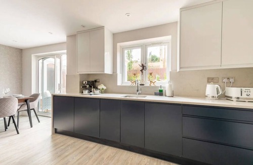 Welcome to Lambly Hill, Virginia Water, a stylish four-bedroom home nestled in one of Surrey’s most prestigious neighbourhoods. This elegant property offers a perfect blend of modern comfort, sophisticated design, and premium amenities, making it ideal for guests seeking both relaxation and convenience. The spacious living area features plush seating, a Smart TV, and large windows that flood the room with natural light, creating a warm and inviting atmosphere. The open-plan layout flows seamlessly into the dining space, perfect for family meals or entertaining friends. A charming conservatory provides a tranquil spot to unwind while enjoying views of the garden. Contemporary decor, soft lighting, and high-quality furnishings enhance the luxurious feel throughout the home.