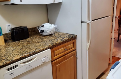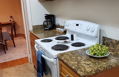 Historic landmark French village townhome, hardwood floors throughout, dining room with French doors for view unto the tropical patio, master king bed bedroom upstairs with cathedral ceilings, refrigerated Air Conditioning, washer, dryer, full kitchen, security system available if needed, TV, high speed fiber optic WIFI, fireplace. Fold out couch for extra guests. Hairdryer, Iron, Heat and Air-condition.