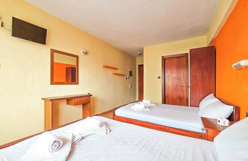 The room features two double beds, arranged in a way that ensures comfort and privacy for guests. The décor follows neutral tones and functional furniture, creating a warm and welcoming atmosphere.