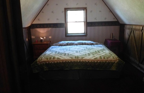 KING: Private King Room with a Swiss Chalet style OPEN LOFT private seating area. This area can also can accommodate 2 cots or air mattress for extra sleeping space (in the OPEN LOFT). (20.00 per extra person fee applies). Loft over looks the main dining room area.