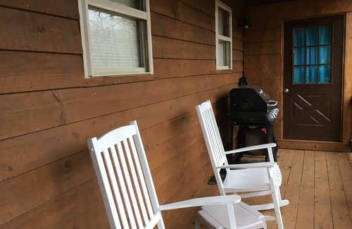 The cabin consist of 1 bedroom with a queen size bed and plenty of mood setting candles. A fully equipped kitchen including a dishwasher but no food provided. It has 1 bathroom with a washer and dryer. The living-dining room combination has a gas log fireplace, air conditioner and satellite TV. It, also, has a front porch with rocking chairs and gas grill. Located off the front porch is the hot tub room.