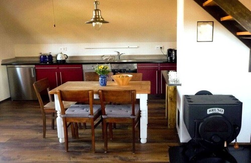Welcome to our holiday apartment, which has been furnished with great attention to detail. On 70 square meters, you will find everything you need to feel completely comfortable on your Baltic Sea vacation. The apartment extends over two floors. In the lower part there is an open kitchen, a cozy seating area, the bathroom and a separate toilet. The kitchen is equipped with everything you need for self-catering. In summer you can have breakfast on the terrace, in winter you can sit by the warming fireplace. In the upper area, the attic, you can dream wonderfully. There is an open sleeping area, equipped with a large double bed and a bedroom with two beds, ideal for children.