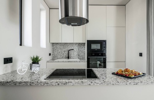 Master Double Bedroom with King Size bed (1.80x2.00), featuring en suite bathroom with open plan in-room bathtub with hydromassage facilities, shower & sink, Smart TV 40’’, lightened up with natural light by the large window • Double Bedroom with King Size bed (1.80x2.00), en suite bathroom with shower cabin, Smart TV 40’’, access to balcony with comfy sitting • Twin Bedroom with two Single beds (0.90x2.00) that can be joined with top mattress to form a King Size bed upon request, en suite bathroom with shower cabin, Smart TV 40’’, access to balcony with comfy sitting. • Common area of the first floor : the living room offers a double sofa bed where two extra guests can be accommodated.