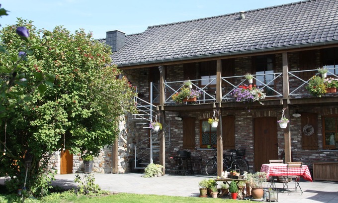In every season, Aux deux Bouleaux offers relaxation and a magical ambience for your vacation days. Our lovingly furnished apartment Vue au Jardin is ideal for 2 people and is located in a restored Belgian farmhouse with a view of the border triangle (B / NL / D) and the Hombourger pastureland in a scenic location. The apartment offers a view of the garden and the front swimming pond. It is accessible on the 1st floor via an external spiral staircase and separate entrance and has a living room and a kitchen with dining area and reading corner, a shower room and the adjacent covered balcony with a view of the garden and the sunset. Here you can enjoy the evening hours in (almost) any weather.
