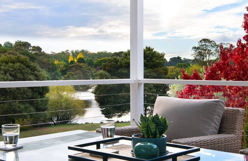 Vue Villa is a luxurious and contemporary two bedroom (one king size and one queen size), two bathroom home with multiple indoor and outdoor entertainment spaces. Cosy up by the gas log fireplace in the lavishly styled living space, or enjoy a long lunch on the covered deck while the sun sets over the lake. After dusk, make your way to the fire cauldron in the terraced garden and stargaze under the giant red gums at the property's edge.